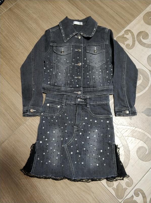 Очень красивый и нарядный джинсовый костюм на рост 122. В идеальном состоянии. Украшен стразами, камушками, на юбке есть гипюровые вставки.