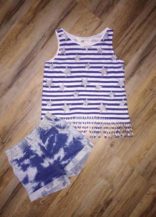 Комплект на 5-6 років Майка фірми H&M по бірці 8-9 років але реально менше дивіться виміри ( довжина без порізів 38см, довжина з порізами 46см, ПОГ 34см) Шорти фірми b.p.c. ( довжина 23.5 см, пот 26 см ще тягнеться в поясі резинка)