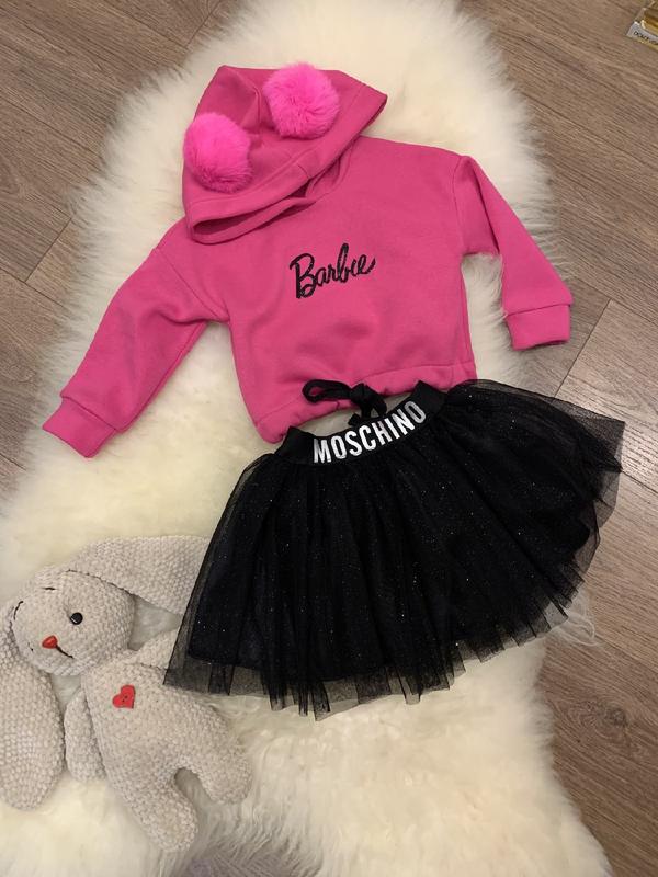 Милашный костюмчик для маленькой принцессы кофточка - ткань 3х-нить на байке , в поясе есть утяжка , капюшон украшен помпонами , спереди блестящая надпись Barbie юбочка -3 слоя фатина , есть подъюбник , в поясе широкая резинка Длина/рукав от горловины/пог/длина юбочки /пояс 104-32/40/34/29/22 110-34/42/35/30/22 116-36/45/35/33/23 122-39/48/36/34/24 128-40/52/39/37/24 104- 110-1шт 116- 122- 128-1шт.мас
