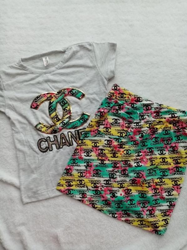 Дитячий костюм : футболка + спідничка 5-6 років Заміри: Футболка довжина: 40 см, пів талія: 29 см Спідничка: ширина 32 см, довжина 33 см