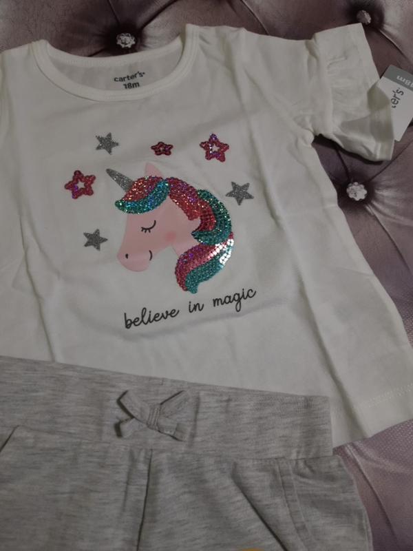 Футболка фірми Carter ' s на 18 місяців і шорти фірми George на 12-18 місяців. Шорті купувала набір з двох одиниць. Одні шорти використала для своєї донечки, другі залишилися, тому зробила такий комплект. Усі речі нові.