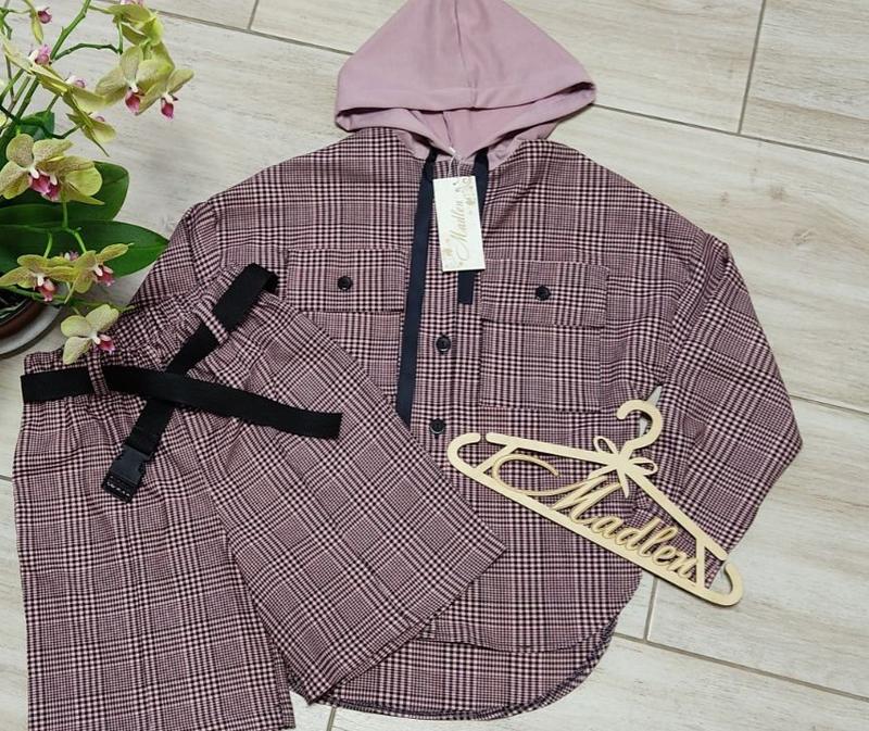 🍊 Модный костюм для девочки подростка в клетку. В комплект входит: рубашка и удлинённые шорты-бермуды. Рубашка спереди короче сзади длиннее, имеется капюшон, застёгивается на пуговицы, шов рукава приспущен, манжет застегивается на пуговичку. Бермуды в поясе на резинке, резинка отлично тянется. В комплекте имеется тканевый ремешок. Материал: костюмка-коттон-стрейч ПОЛНОМЕРКА!!! 140рост 146рост 152рост 158рост 164рост