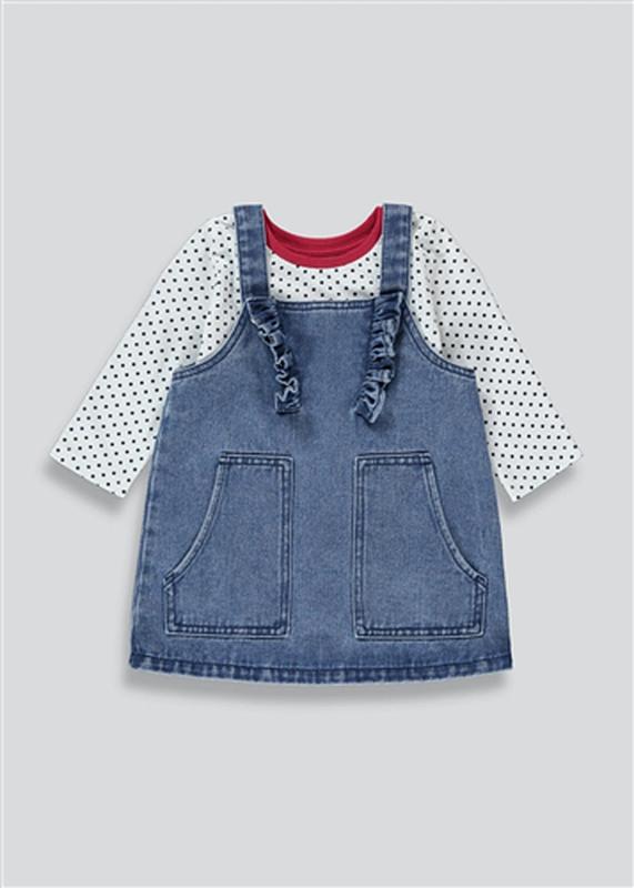 Набор для девочки MATALAN (джинс.сарафан+реглан) на 2-3 года на р.92/98. Супер-милый джинсовый сарафан с оборчатыми бретельками и карманами идет в комплекте с верхом в горошек с длинными рукавами. Состав. Верх: 100% хлопок. Сарафан: 100% хлопок.