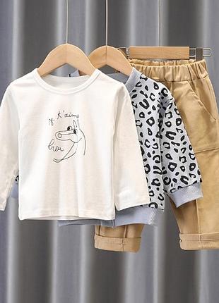 Классные костюмы тройки. 💠 Кофта модный принт этого сезона, материал двунитка , штаны плотный котон со стрейчом; 💠 Белая кофточка с длинным рукавом; 🌼Размеры:🌼 Р. S - 1 шт; Р. M - 1 шт; Р. L - 1 шт; Р. XL - 1 шт; 🦋Замеры (длина рукава до воротника): 🦋 Р. S кофта длина 33, рукав 32, ширина 29, штаны длина 45, шаг 25 см (р.80); Р. M кофта длина 34, рукав 34, ширина 31, штаны длина 47, шаг 27 см (р.90); Р. L кофта длина 37, рукав 36, ширина 32, штаны длина 52, шаг 29 см (р.100); Р. XL кофта длина 40, рукав 39, ширина 34, штаны длина 54, шаг 32 см (р.110);.сюрпкид