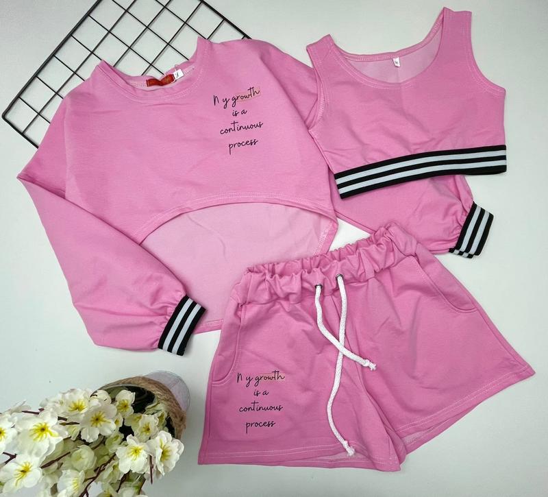 ТРЕНД СЕЗОНА! костюмчик тройка (реглан+топ+шорты) ☂️ткань двунитка пенье шорты с карманами КАЧЕСТВО СУПЕР! размер/☂️дл.по боковому шву/пог/рукав от горловины/☂️дл.топа/пог/☂️дл.шорт/пог/поб 146/☂️33/44/59/☂️28/32/☂️33/28/52-4шт 152/☂️36/45/62/☂️29/34/☂️34/29/53-4шт 158/☂️37/47/64/☂️31/35/☂️36/30/54-1шт.хепбеб