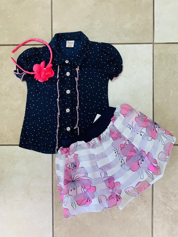 Нарядный костюмчик для девочки. Производство Турция. Замеры: размер 92 см- блузка- плечи 21 см, длина 36 см, ширина 27 см, юбка- талия 54 см, длина 24 см; размер 98 см- блуза - плечи 22 см, длина 38 см, ширина 28 см, юбка - талия 56 см, длина 27 см