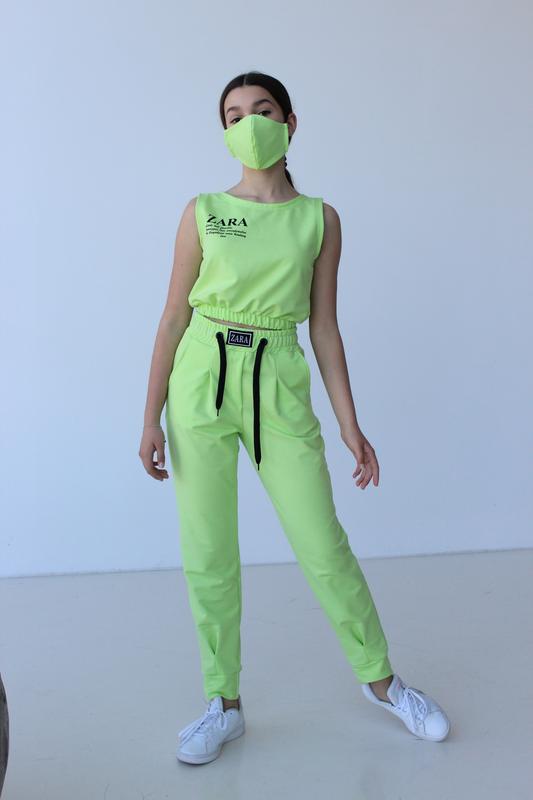 Новий костюм Zara Топ + маска + штани Тканина турецька двонитка Розміри 140-146-152-158-164 Топ Розмір 140- довжина 36 п/обхват 39 Розмір 146- довжина 37 п/обхват 40 Розмір 152- довжина 38 п/обхват 41 Розмір 158- довжина 40 п/обхват 42 Розмір 164- довжина 41 п/обхват 43 Штани Розмір 140- довжина 86 пояс 28 Розмір 146- довжина 90 пояс 28 Розмір 152- довжина 91 пояс 29 Розмір 158- довжина 95 пояс 30 Розмір 164- довжина 98 пояс 30 Колір :салатовий, ліловий, жовтий, гірчиця, білий, голубий, світлий беж, графіт, темний беж,фісташка, помада, малина, чорний.