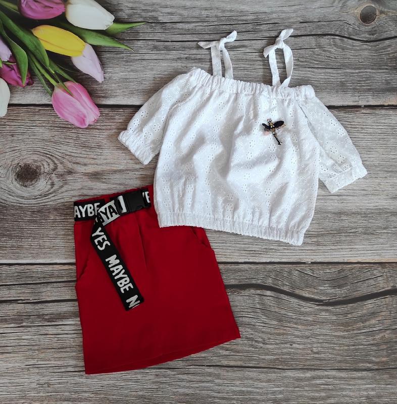 🧡В наличии 🧡 Костюм для девочки Юбочка -стрейч-коттон, кофта-батист с вышивкой-прошва. Кофта ткань батист с вышивкой-прошва, на плечах завязывается на завязки Юбочка ткань стрейч-коттона, в поясе на резинке, есть два кармана. В комплекте ремешок замеры:длина/пог/длина/пояс 134-36/37/34/25 140-38/38/35/26 146-39/40/36/27 152-40/42/38/28 158-41/44/40/29 м