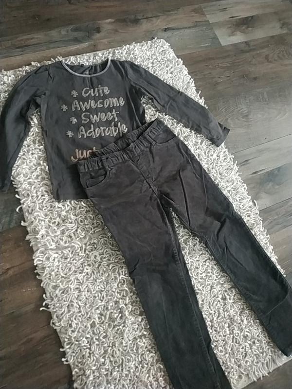 Комплект в отличном состоянии. Футболка- ПОГ33 отлично тянется Длина 45 Брюки ПОТ39(резинка) Длина 74 ПОБ34(отлично тянутся)