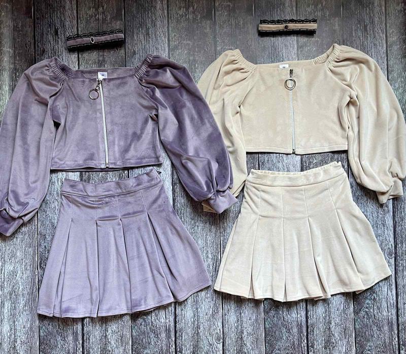 Стильный велюровый костюм с чокером. В топе плечи на резиночке. В юбке есть боковая молния,по спинке резинка. Размеры 140-158