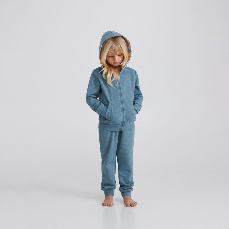 Домашний комплект для девочки из хлопка с добавлением полиэстра и эластана. В комплект входит кофта на молнии с карманами и капюшоном, и брюки. Рукава и штанины на манжетах. Состав: 52% хлопок, 42% полиэстр, 6% эластан