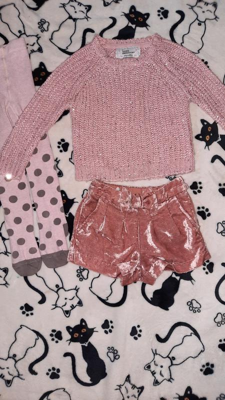 Очень нарядный комплектик на девочку 2-3 лет . Очень нежный цвет. Свитерок с паетками переливаетмя , велюровые шортики next c милым бантиком сбоку на замочке.смотрится просто супер. Состояние отличное . Колготки next в подарок. Без торга, на сообщения о торге отвечать не буду. Цены на вещи у меня адекватные.