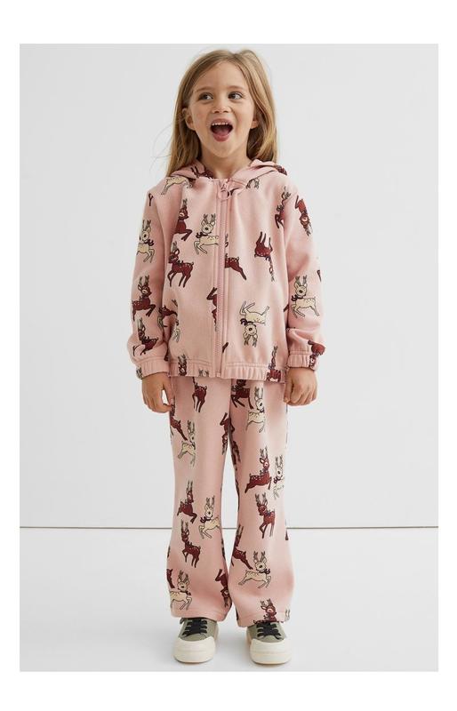 Стильный и теплый костюм H&M на девочек. В комплекте толстовка и штаны с мягким и теплым начесом (байка). Костюм из трикотажа пудрового цвета с принтом оленей по всей поверхности. Толстовка теплая с застежкой на молнию и резинками на рукавах и внизу изделия. Капюшон с трикотажной подкладкой. Штаны теплые, модного свободного кроя с резинкой на поясе. Костюм без карманов. Трикотаж отличного качества, не линяет, не деформируется и не образует катышков. Замеры сделаны по одному комплекту в размерах! В наличии есть размеры: 104 на 3 - 4 года. Толстовка: длина 41, ширина под руками 39, плечи 32, рукав 34. Штаны: длина 58, шаговая 40, пояс 24. 110 на 4 - 5 лет. Толстовка: длина 44, ширина под руками 39, плечи 32, рукав 36. Штаны: длина 62, шаговая 43, пояс 25. 116 на 5 - 6 лет. Толстовка: длина 45, ширина под руками 40, плечи 34, рукав 40. Штаны: длина 68, шаговая 47, пояс 25. 122 на 6 - 7 лет. Толстовка: длина 46, ширина под руками 43, плечи 36, рукав 41. Штаны: длина 71, шаговая 49, пояс 26. 128 на 7 - 8 лет. Толстовка: длина 50, ширина под руками 42, плечи 35, рукав 44. Штаны: длина 75, шаговая 53, пояс 28. 134 на 8 - 9 лет. Толстовка: длина 53, ширина под руками 46, плечи 37, рукав 48. Штаны: длина 82, шаговая 56, пояс 28. 140 на 9 - 10 лет. Толстовка: длина 54, ширина под руками 48, плечи 40, рукав 50. Штаны: длина 85, шаговая 59, пояс 29.