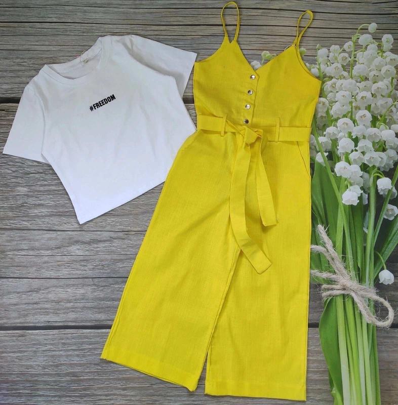 Модний і стильний комплект футболка+комбез- кюлоти Комбез має завищену талію на кнопках Має кишені і пояс в комплекті Тканина футболки супрем, комбез льон ЯКІСТЬ БОМБА! Довжина вказана з врахуванням бретелей Бретельки не регулюються 134р (2 шт) длина 37, пог 34, длина 95 пог 31, шаг 42, поб 35 140р (1 шт) длина 40, пог 37, длина 100 пог 33, шаг 44, поб 36 146р (2 шт) длина 44, пог 38, длина 105 пог 34, шаг 47, поб 38 152р (1 шт) длина 45, пог 39, длина 108 пог 35, шаг 48, поб 39 158р (1 шт )длина 48, пог 41, длина 115 пог 37, шаг 52, поб 41 164р (1 шт) длина 50, пог 34, длина 120 пог 39, шаг 55, поб 44