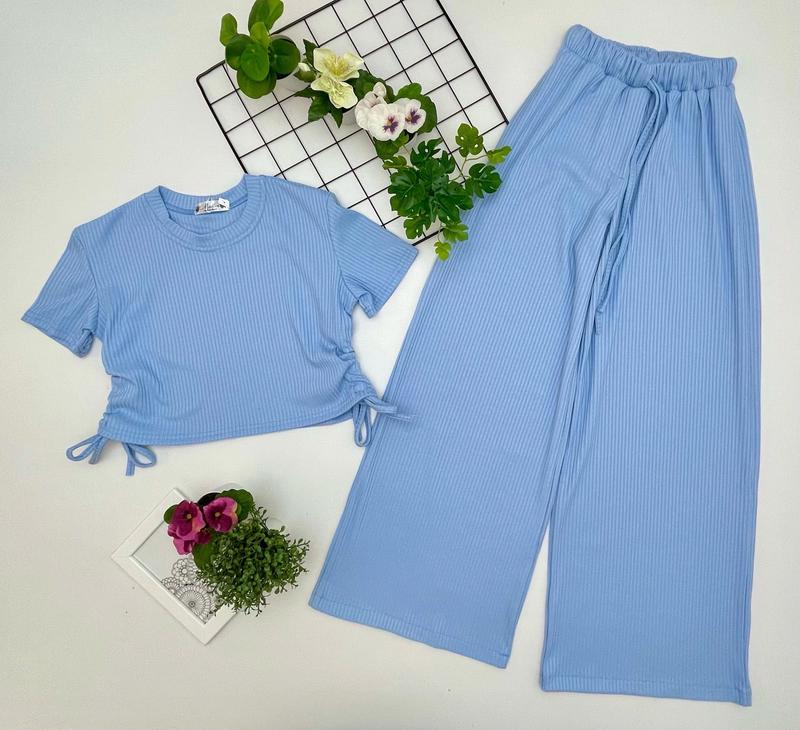 🌿Трендовий костюм з мустангу палаццо та топ на затяжках тканина-мустанг 🌿Преміум якості! розмір/🌿довж.топа/пог/🌿довж./крок/пот/поб 140/🌿35/40/🌿88/63/26/44 146/🌿36/41/🌿91/65/27/46- 152/🌿38/42/🌿95/68/28/48- 158/🌿40/43/🌿98/70/29/49 164/🌿43/44/🌿101/73/30/50- +-2см