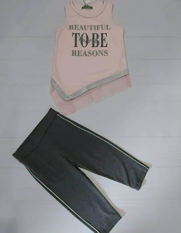 Стильный костюм на девочек с туникой и короткими лосинами. Туника персикового цвета с принтом и вставкой из мягкого фатина. Лосины серого цвета с серебристыми лампасами. Материал хлопок. Производство Турция фирма Cichlid