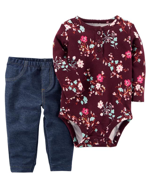 Бордовый бодик в цветочки с синими штанишками в размере на 24 месяца. Бодик: длина 49 см, полуобхват груди 27 см, длина рукава по внешнему краю 33см\ по внутреннему 26 см. Штаны: длина 47,5 см, полуобхват бедер 29 см.