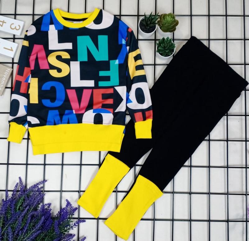 💥У НАЯВНОСТІ 🌟 Костюм на дівчинку, стильний, модний, яскравий. 🔸 Щільний трикотаж, створює ніжний і модний образ вашій дитині. 🔸В комплекті класні гетри. 🔸Малюнок накат. 🔸Виробник.Туреччина 🔸Якість відмінна 🔹При виборі орієнтуйтесь за розмірами. Заміри: довжина/ширина/дв. рукава від горловини .штани довжина/ширина. 3-4год.-коф.45/33/49.штани57/28 - 2 шт 4-5год.-коф.46/36/51.штани60/29 - ,3 шт 9-10год.-коф.56/42/59.штани72/33 - 2 шт 415грн.