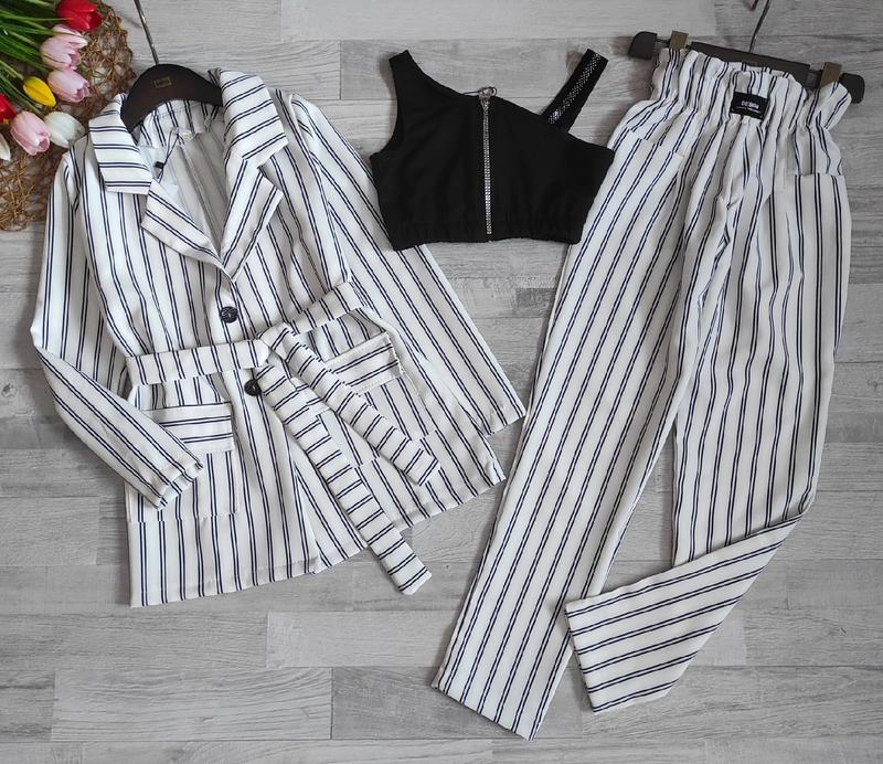 Стильный костюм тройка: стильный жакет+ топ+ стильные момы Ткань костюмка Армани ПОЛНОМЕРЫ Цена 750 грн замеры:жакет длина/рукав/пог-топ длина/пог-штаны длина/шаг/пояс 134-52/47/38-25/30-83/63/23 140-55/50/39-25/31-86/66/24 146-57/53/40-26/33-90/68/26 152-60/55/41-27/35-93/71/26 158-64/58/43-27/37-99/75/27 164-66/60/45/28/39/101/77/28