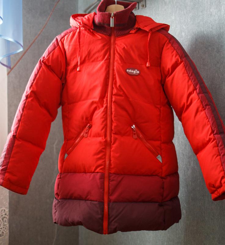Зимний детский пуховик. Стеганный на молнии с капюшоном. Цвет красивый ярко-красный фото бледнее передает цвет( как на фото 3-4 примерно) В области шеи трикотажный широкий воротник. По бокам внизу карманы на молнии. Внизу комбинирован несколькими полосами цвета ближе к бордо. Тепленький, легкий, добротный. Состав - перо, пух, Качественная, фабричная вещь. Носили аккуратно, пару сезонов. Стал мал. На младший школьный возраст 7-9лет примерно. Состояние 11/12.