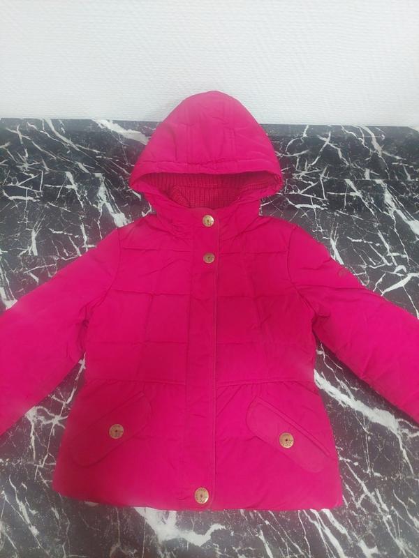 Пуховик-жилет с капюшоном для девочки. Цвет-насыщенный малиновый. В середине утеплен жилетом. Есть легкие потертости на швах рукавов. Замеры и потертости на фото.