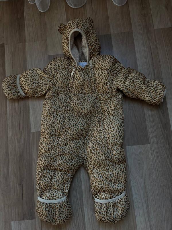 Сильный и качественный комбинезон Gap на возраст 6-12 мес Верх - мягкая непромокаемая ткань, подкладка - флис джаза рукавах - нейлон 76. Рукава и низ брюк вшиты резинки. Варежки и пинетки отворачиваются. В капюшоне махра. Наполнитель Primaloft (искусственный пух) (не полифил) температурный режим до -20-25