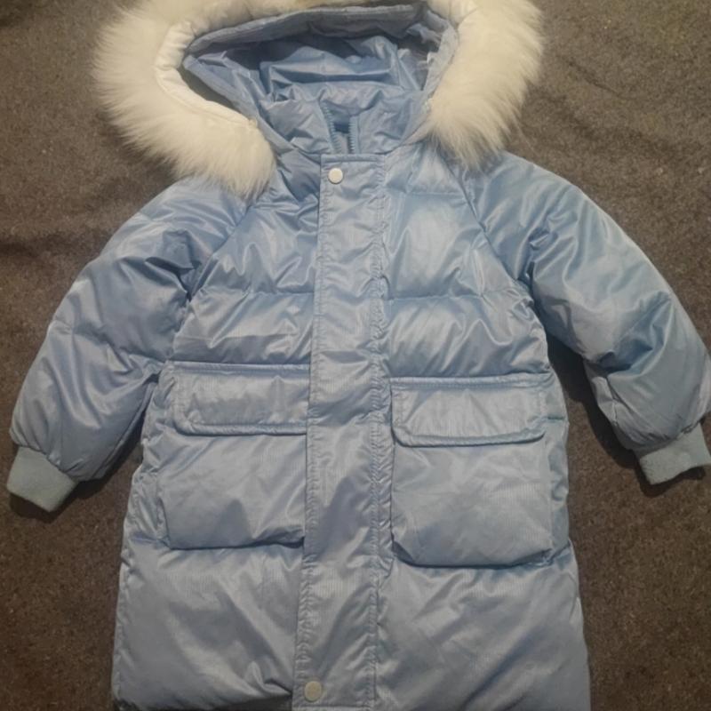 пуховик детский, Деми, мех белый отстегивается, рукав от шеи 45 см, длина 53 см, ширина по спинке 42 см