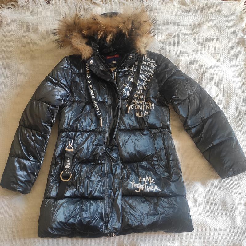 Зимняя куртка для девочки. Очень теплая. Подкладка на флисе. Необычный цвет. Она играет на свете как хамелеон. Снаружи будто бархатистая. Стиль дополняют надписи по куртке. Размер 152. На капюшоне мэх можно снять, он на пуговицах. Рукава с манжетами. Состояние новой вещи. Носил ребенок одну зиму, очень опрятно.