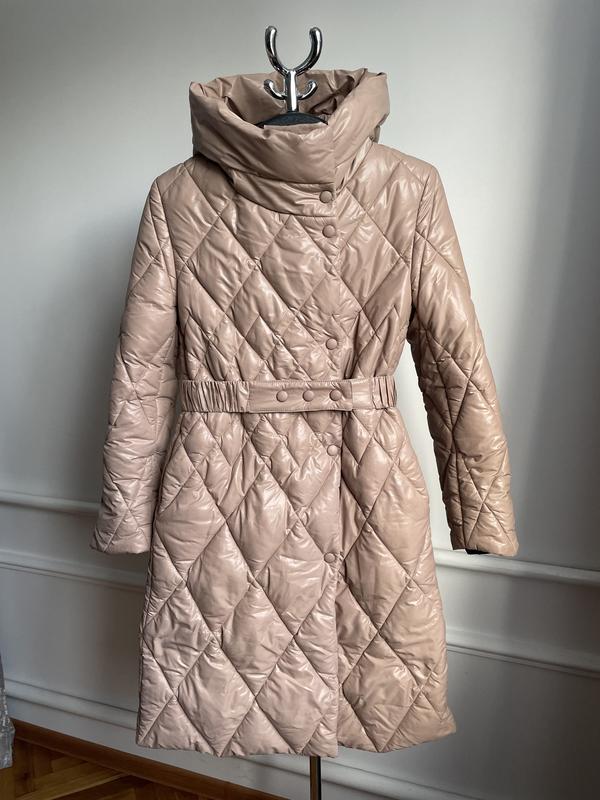 Пуховик у відмінному стані бежевого кольору трішки з рожевою ноткою, єдина вада це замочок який можна поремонтувати або замінити. Довжина 101 см Пів обхват у грудях поверх виробу-50 Пів обхват у бедрах- 58 Довжина рукава від шиі- 75