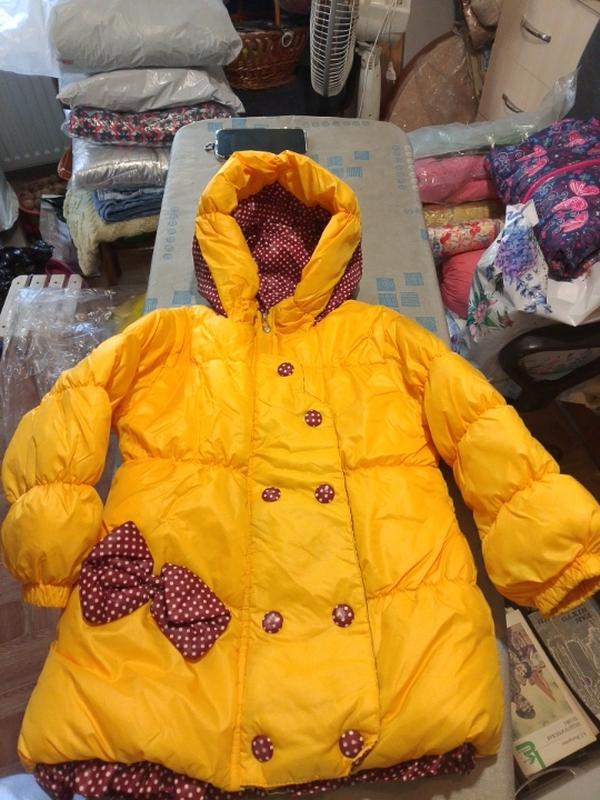 куртка пуховик для девушки 3-4 лет на холодную осень или или теплую зиму, желтого цвета,меет незначительные дефекты на кнопках от стирки