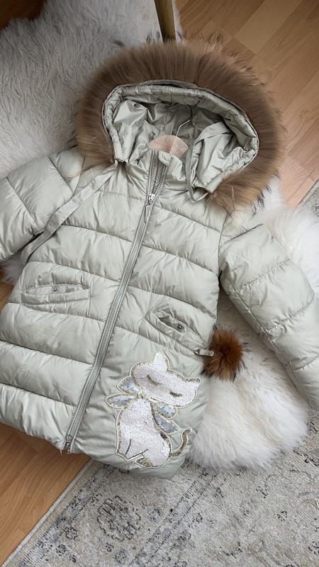 Дуже красива і тепла! Колір вживу ще гарніший ( камера не передає ), ніжно - оливковий . Не збита , плям , потертостей немає , без нюансів. Хутро натуральне відстібається , сам капюшон теж ! Заміри - Довжина від плеча до низу - 58 см Довжина рукава від плеча -45 см Ширина по спині під руками - 38 см