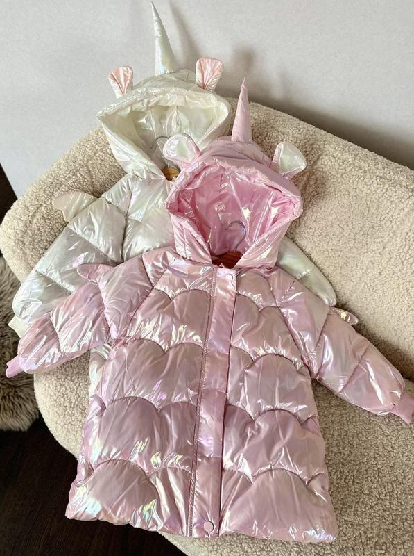Верх курточки - балонь, гарно переливається Наповнювач - холофайбер Підкладка - фліс Застібка - змійка та кнопки Рукава на резиночці Є кишені На спинці - крильця На капюшоні - ріг та вушка Виміри 90-Довжина 50 см Рукав від горла 36 см 100-Довжина 52 см Рукав від горла 42 см ширина 37*2 см 110-Довжина 54 см Рукав від горла 44 см ширина 39*2 см 120-Довжина 55 см Рукав від горла 46 см ширина 40*2 см