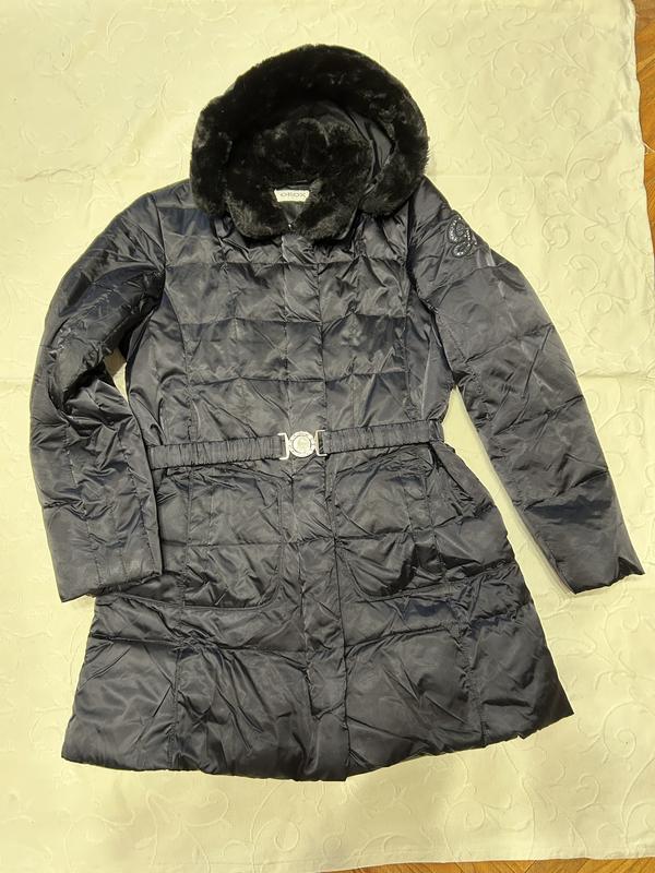 Чорний пуховик Geox подовжений, з капюшоном, під пояс.