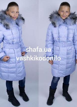 Наполнитель- пух. На капюшоне- натуральный мех, мех отстегивается. Капюшон не отстегивается. Рукава куртки с отворотом для сохранения тепла, манжет трикотажный