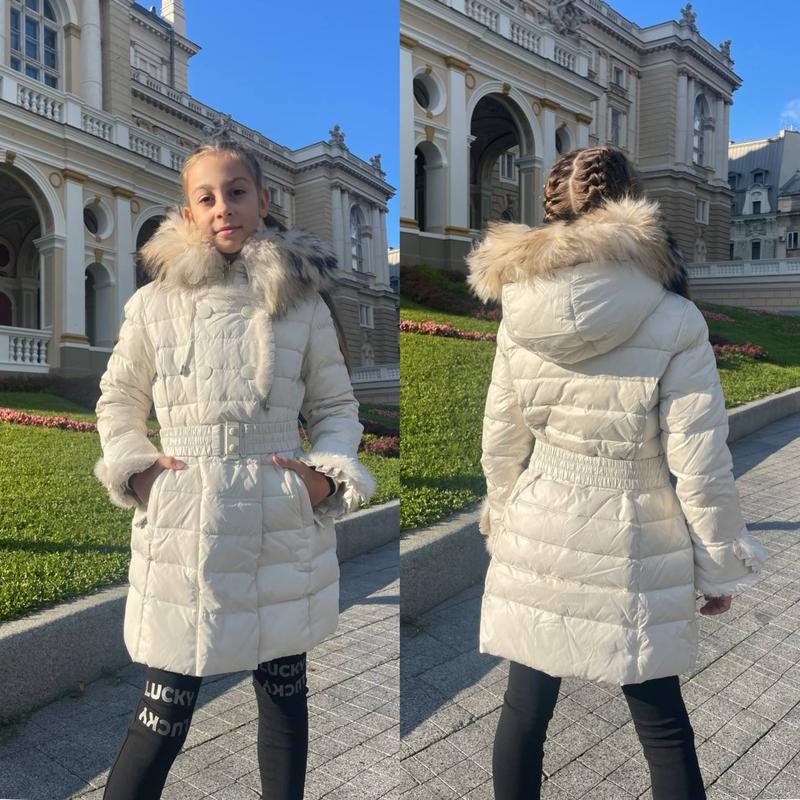 Опушка - натуральный мех, мех отстегивается. Капюшон не отстегивается. Рукава куртки с отворотом для сохранения тепла, манжет трикотажный