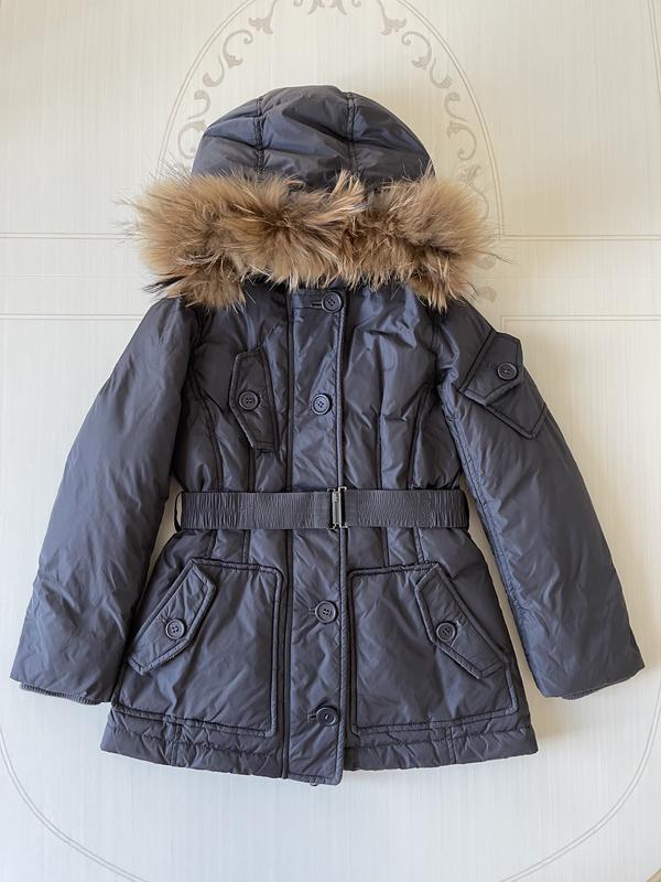 Пуховая куртка для девочки 8 лет, рост 128 см Длина 57 см, ширина под мышками 38 см, по низу 46 см, по низу есть кулиска для утяжки, 31 см, рукав 47 см, рукав от подмышки 35 см, мех отстегивается.