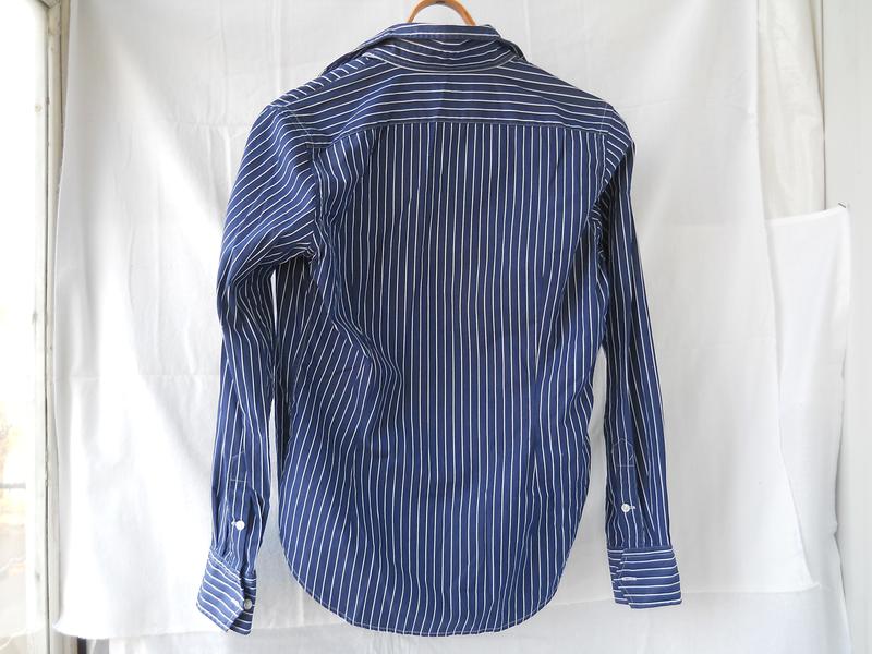 Сорочка синя в білу полоску унісекс (підійде на підлітка як хлопчику, так і дівчинці). Стан відмінний, одягли декілька разів. Модель завужена на талію, спинка довша за перед.
