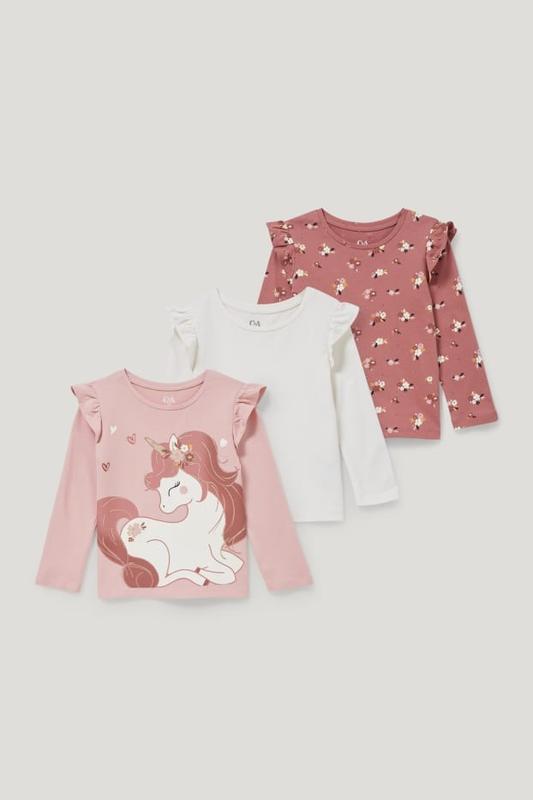 Реглан/лонгслив C&A на 7 лет на р.122 - в наличии 2 шт. (с единорогом и в принт) на 10 лет на р.140 - в наличии 2 шт. (белый и с единорогом) Топы с длинными рукавами из мягкого трикотажа с различными рисунками и оборками на рукавах. Одна версия со сплошным принтом, одна с позиционным принтом и одна однотонная. Состав. 100% хлопок. Цена за 1 шт. 7 лет. длина - 45 см, полуобхват под мышками - 33 см, длина рукава - 42 см, длина плеча - 6 см.