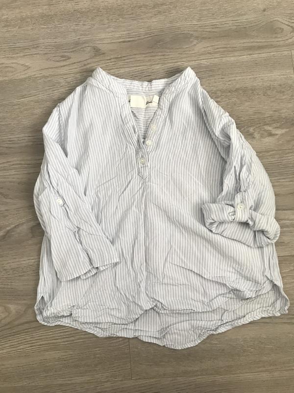 Новая, очень красивая рубашка, белая в нежно-голубую полоску для девочки. Рукава можно сделать как укороченными, так и обычными. По дополнительной информации адресованы в личные сообщения, с радостью ответь на все вопросы.