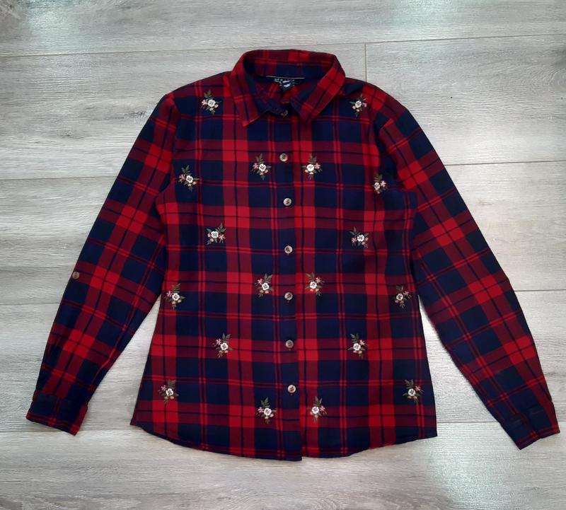Стильна рубашка в клітинку та вишитими квітками. Стан ідеальний.Довжина 60 см, рукав 55 см, ширина під руками 45 см.