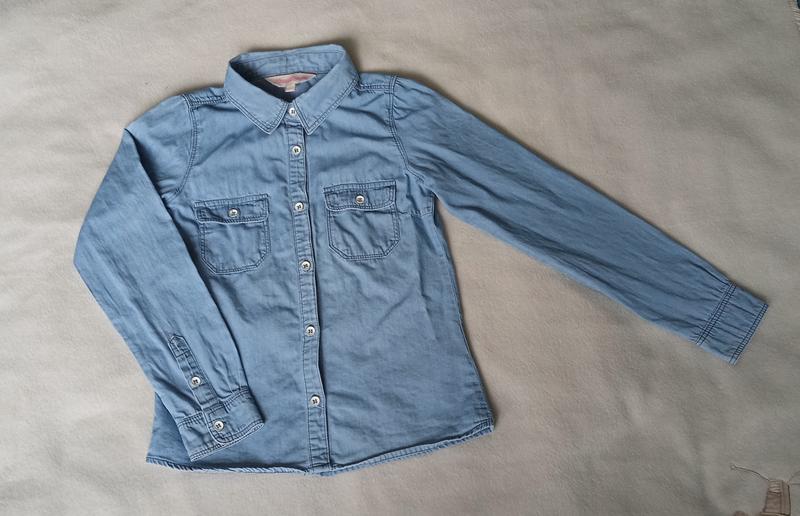 Продается рубашка джинсовая девчачья на длинный рукав. Возраст 7 - 8 лет. Состояние 4 из 5, так как имеет небольшое едва заметное пятно (фото додачу). Рубашка красивая для девушки. Размеры: длина - 48 см, рукав от плеча - 50 см, в груди полуобхват - 33 см.