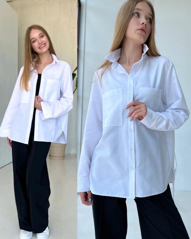 Базова сорочка очень красивая и приятная ткань турецкая рубашечная оверсайз на гудзиках с кармашком есть возможность сделать короткий рукав рекомендую! Рост 140-4шт 146-4шт 152-3шт 158-2шт 164-1шт
