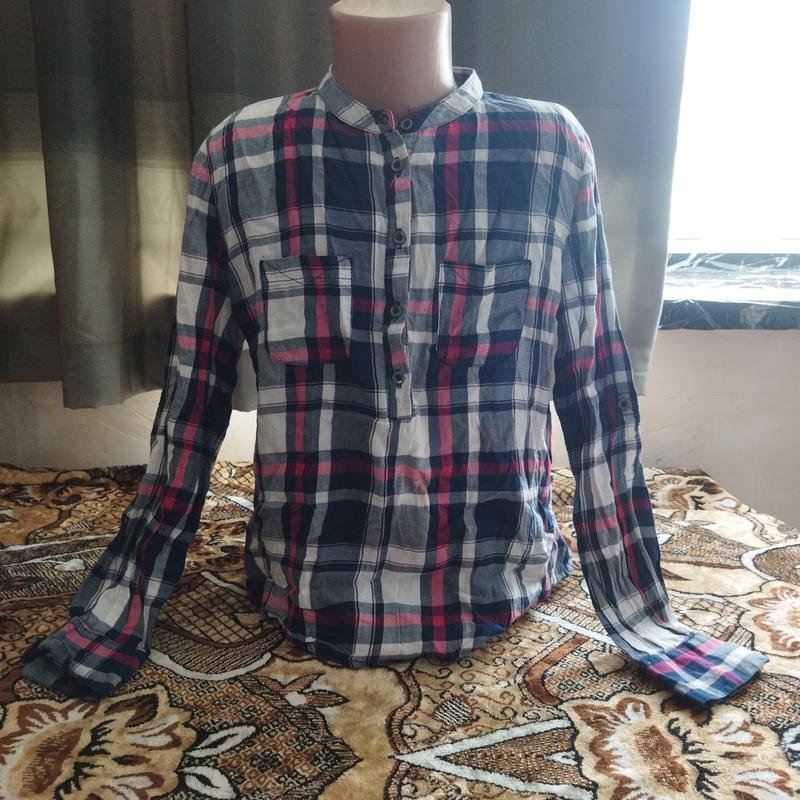Рубашка в цветную клетку. Рукав длинный или три четверти. Есть незначительные дефекты, указанные на 4,5 фото.