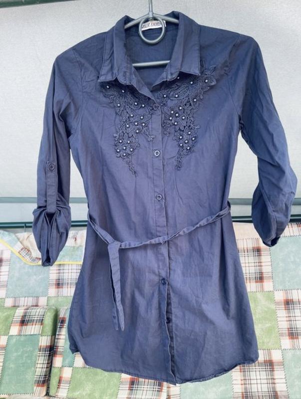 Плаття-сорочка під поясок темно-синього кольору. Відмінної якості та у відмінному стані. Заміри: Довжина 74, плечі 32, рукав 50 (але закріплюється на ґудзик і тоді 3/4, груди 42