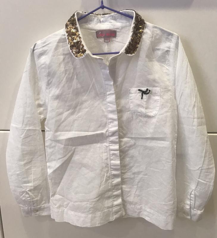 Лёгкая рубашка из хлопка с паетками. Бантик на кармашке с люрексом. Можно заправлять в пояс, можно носить на выпуск. На 5-7 лет. Все замеры на фото)