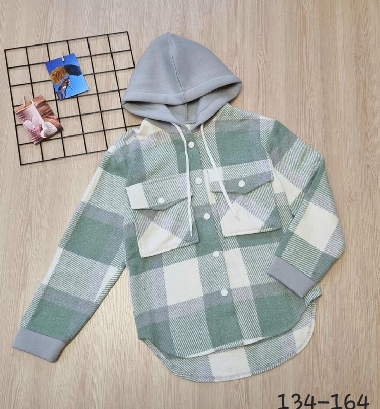 Стильная рубашка для девочки Ткань плотная рубашечная, капюшон и манжеты трехнить Застегивается на кнопки В капюшоне рабочий шнурок 146 (2 шт)-длина спереди 62, рукав от плеча 53, пог 44