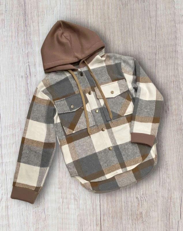 Тепла сорочка Ткань турецкий твид капюшон и манжеты трехнить Застегивается на кнопки С наложенными карманами Хорошее качество! Цена 730 грн рост/длина по переду/пог/рукав от плеча похибка +-2см 152/65/47/55-5шт 158/67/48/56-5шт 164/71/50/58-5шт