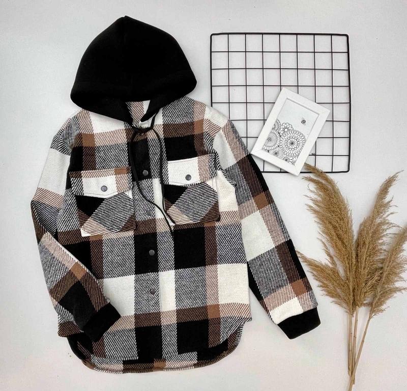 Тепла сорочка Тканина турецький твід капюшон і манжети трьохнитка Застібається на кнопки З накладеними кишенями Гарна якість ! зріст/довжина по переду/пог/рукав від плеча похибка +-2см 152/65/47/55 158/67/48/56 164/71/50/58