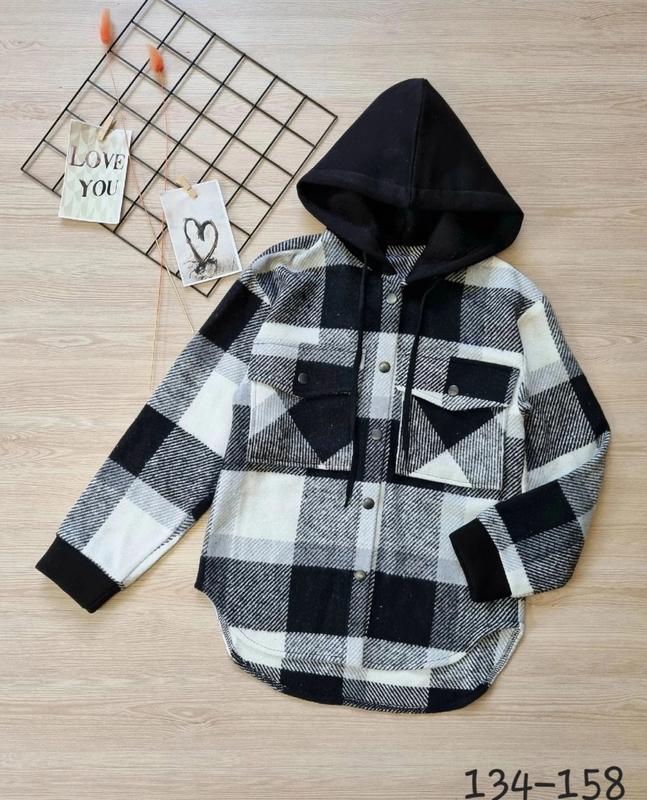 Стильная рубашка для девочки Ткань плотная рубашечная, капюшон и манжеты трехнить Застегивается на кнопки В капюшоне рабочий шнурок 134 (3 шт)-длина спереди 57, рукав от плеча 48, пог 39 +-1 см