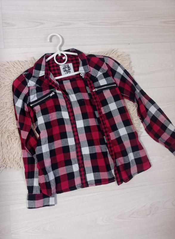 Рубашка в клетку для девочки. Цвет: красный, бордовый, черный, белый. Размер 146/152. Линия груди 38 см. Длина от плеча 52 см. Длина рукава 50 см. Имеет дефект спереди, зацепка 2*2 см под замочком (см последним фото).